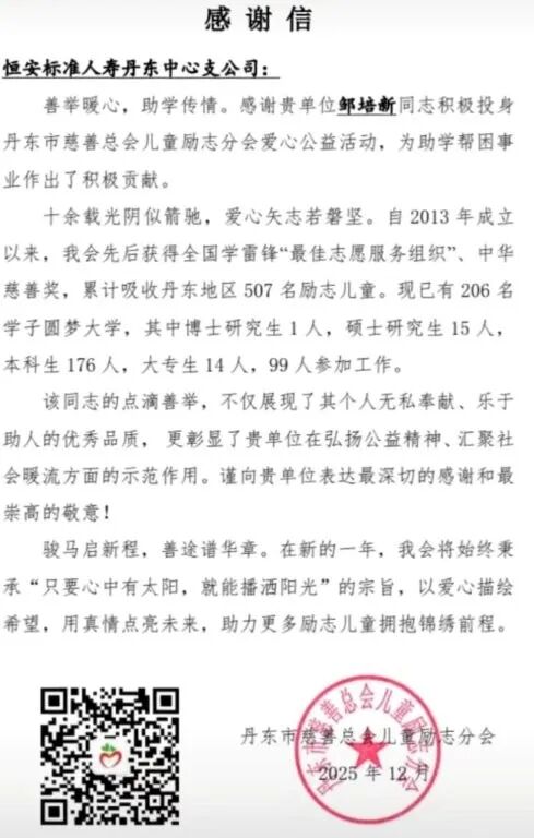 信中指出,邹培新同志积极参与丹东市慈善总会儿童励志分会组织的爱心公益活动,以实际行动为助学帮困事业贡献了力量。其点滴善举,不仅体现了个人无私奉献、乐于助人的高尚品格,也折射出恒安标准人寿丹东中支长期以来积极履行社会责任、大力弘扬公益精神、汇聚向善正能量的良好企业形象与文化氛围。
